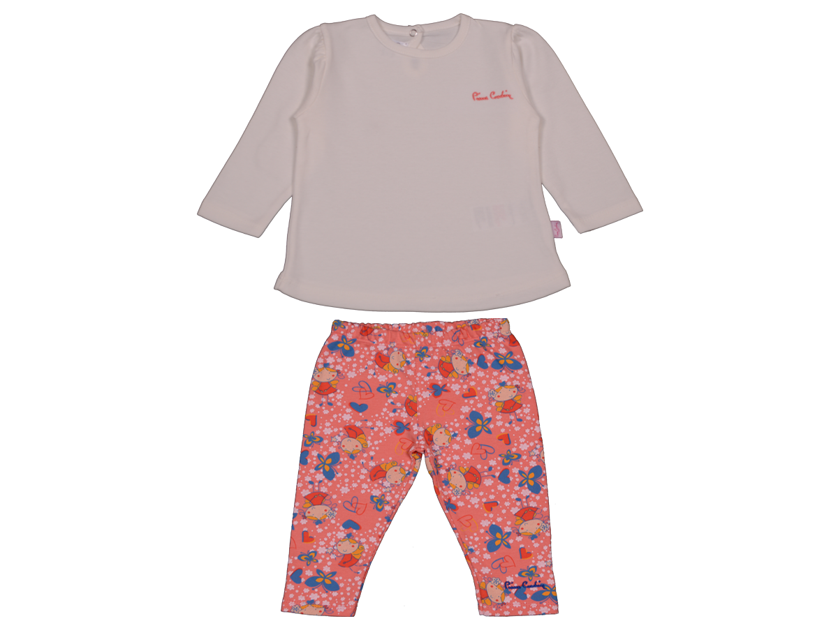 Vaikiška pižama mergaitei Pierre Cardin KIDS su balta viršutine dalimi ir žaismingomis persikinės spalvos kelnėmis.